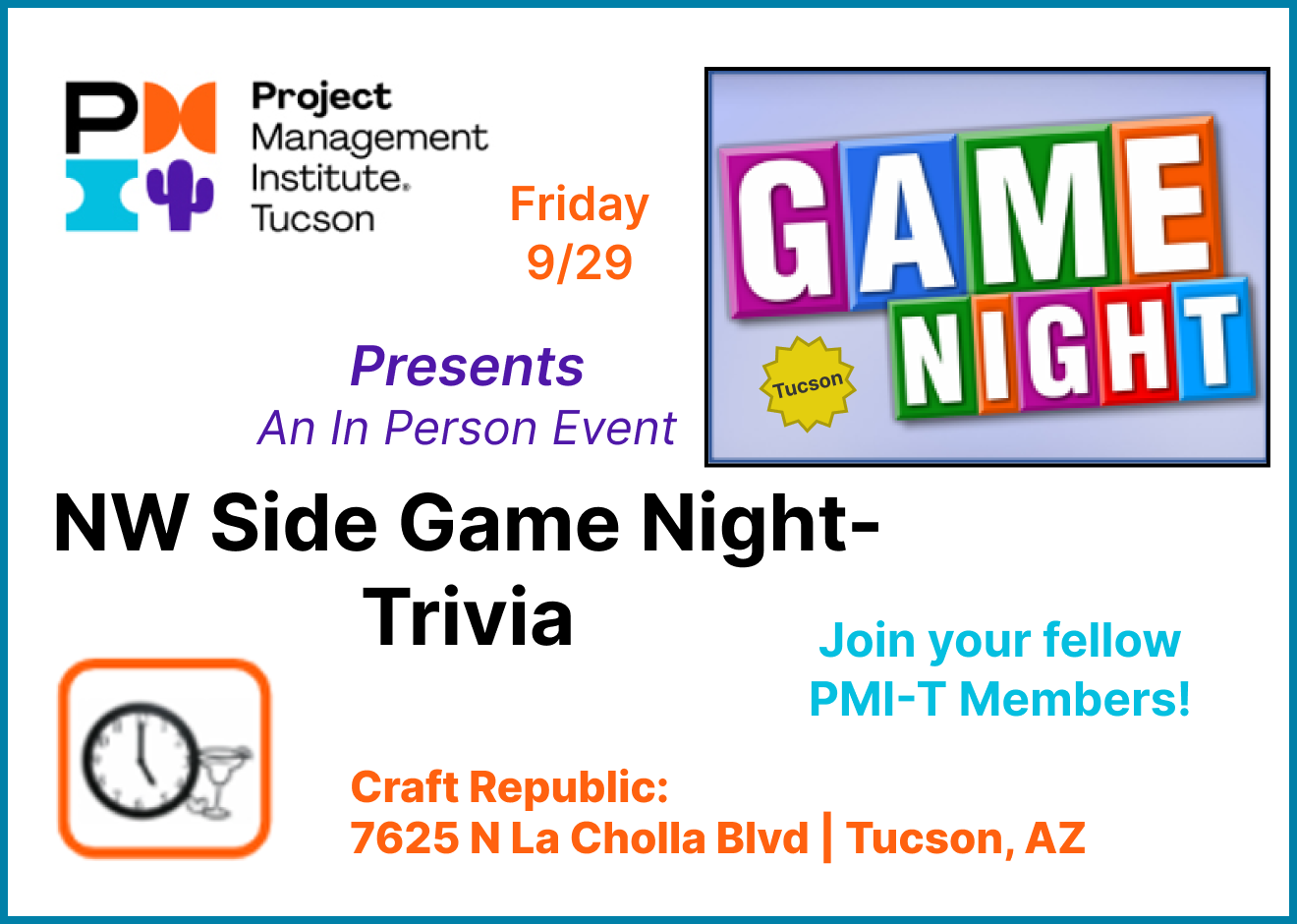 Join PMI-Tucson on the North West Side for a fun night of networking, knowledge-sharing, and games!