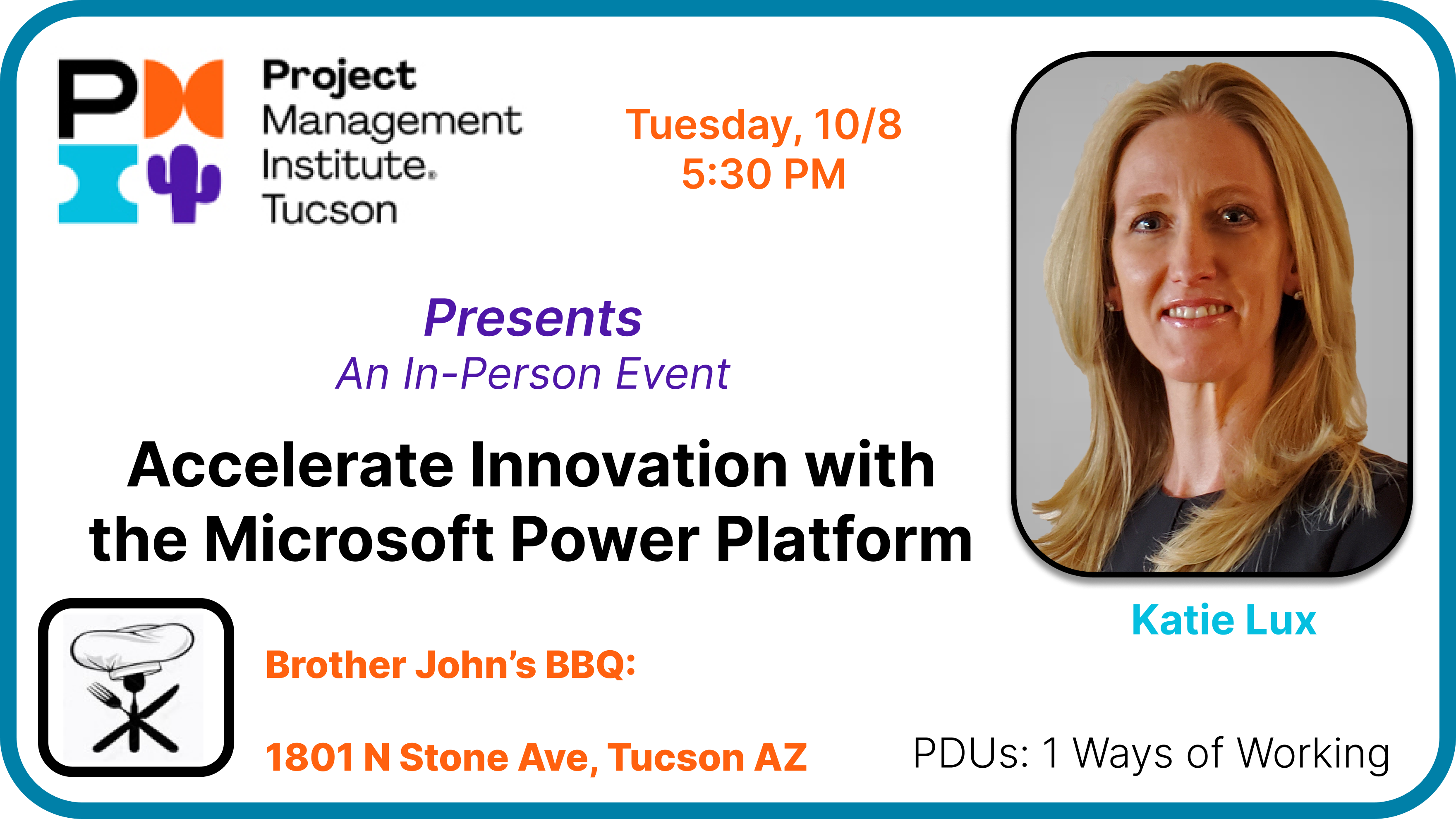 Katie’s journey with Microsoft Power Platform has been quite an adventurous exploration. About 5 years ago, she stumbled across Power BI when she was tasked with the mission to revolutionize the weekly project status reports. The prospect of automating the mundane tasks of generating, saving, and sending out these reports was so easy that Katie became captivated by its possibilities. This journey has taken her from the role of a project coordinator to the Innovation Team and eventually to a permanent position where her primary focus is building dynamic solutions. Katie finds a lot of joy in sharing what she’s learned so far and helping others discover innovative ways to tackle challenges that might seem insurmountable. Katie currently serves as the VP of Finance for PMI Tucson Chapter.