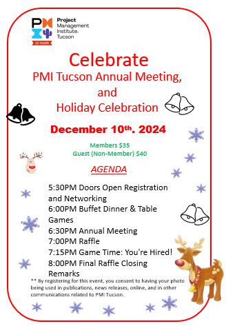 Join PMI-Tucson and its diverse membership as we celebrate our achievements and activities of 2024 and outline our goals and objectives for 2025. In today's fast-paced and ever-evolving world, businesses and organizations are constantly seeking innovative ways to manage projects efficiently and effectively. By connecting with peers who share your passion, you can exchange experiences and cultivate vital relationships within the project management community. PMI-T is an invaluable resource for your personal and professional growth. Everyone is invited, whether you're an active PMI Tucson Member or are looking for a reasoning to become more engaged in a volunteer role.